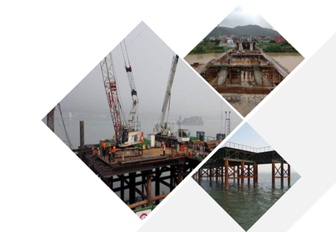 • 常見(jiàn)的施工平臺(tái)主要形式有:單棧橋平臺(tái)、雙棧橋平臺(tái)、利用鋼護(hù)筒導(dǎo)向和承載的平臺(tái)、利用圍堰或筑島承載的平臺(tái)、移動(dòng)式平臺(tái)、水中整體吊裝平臺(tái)